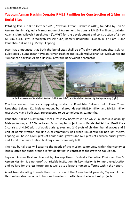 Yayasan Azman Hashim Donates RM13.7 million for Construction of 2 Muslim Burial Sites