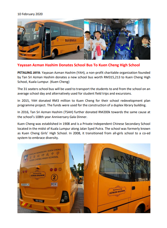 Yayasan Azman Hashim Donates School Bus To Kuen Cheng High School