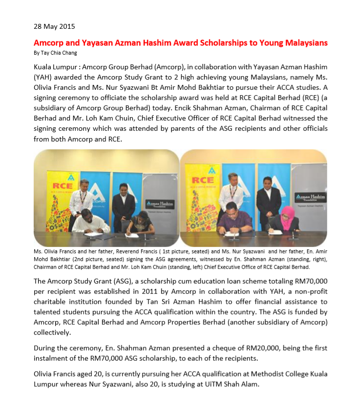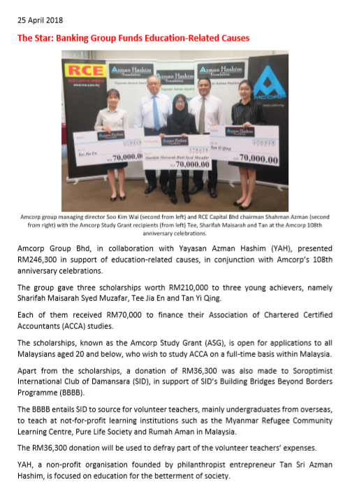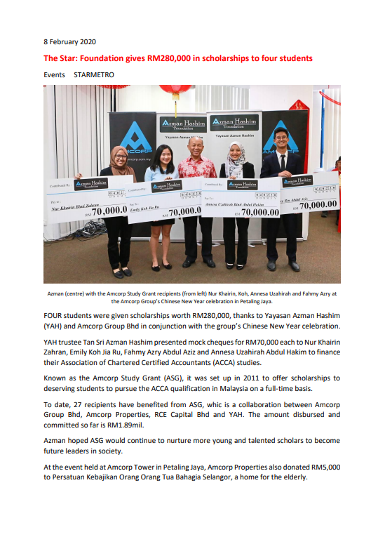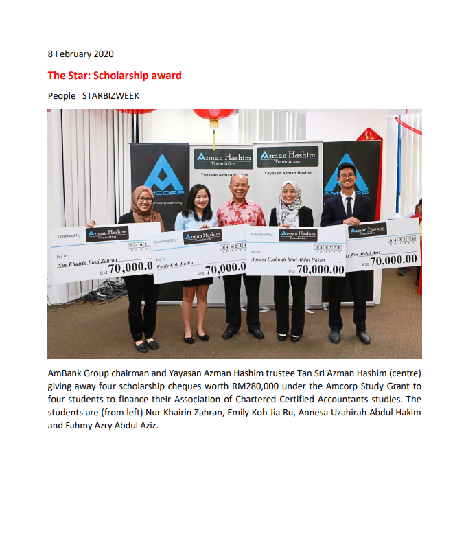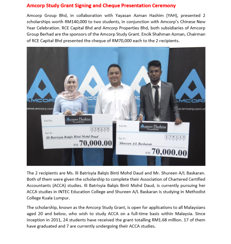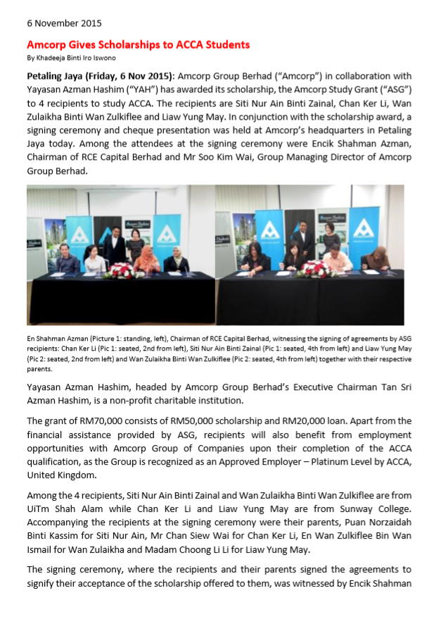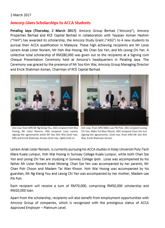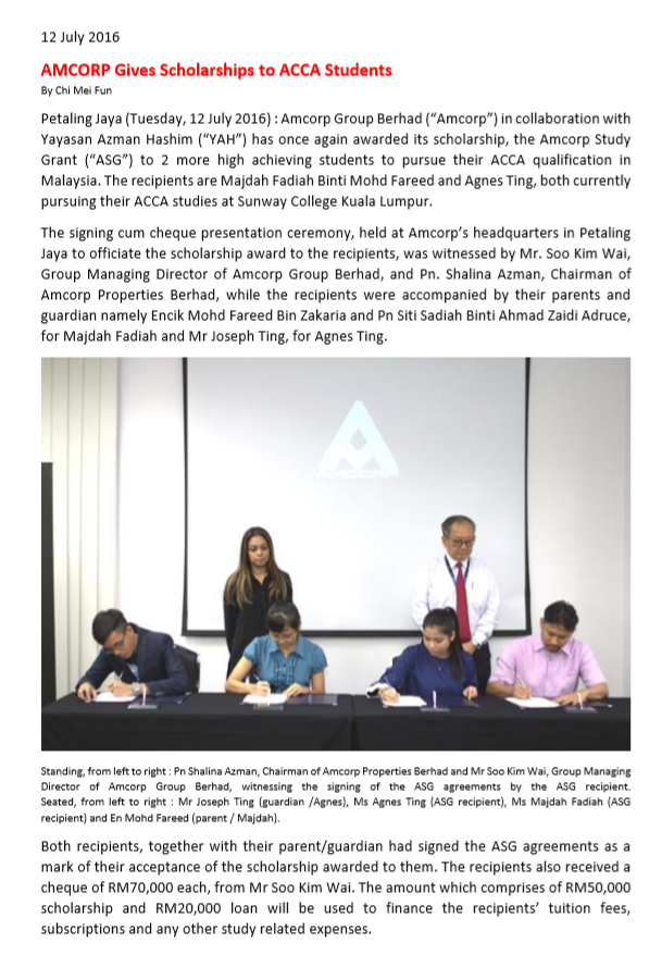 The Sun Daily : Amcorp Gives Scholarships to ACCA Students
