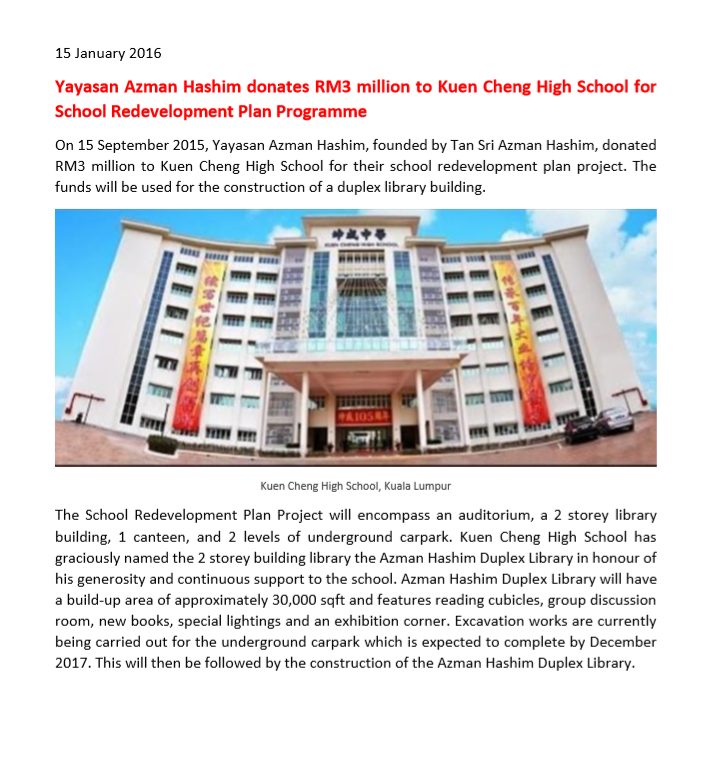 Yayasan Azman Hashim donates RM3 million to Kuen Cheng High School for School Redevelopment Plan Programme