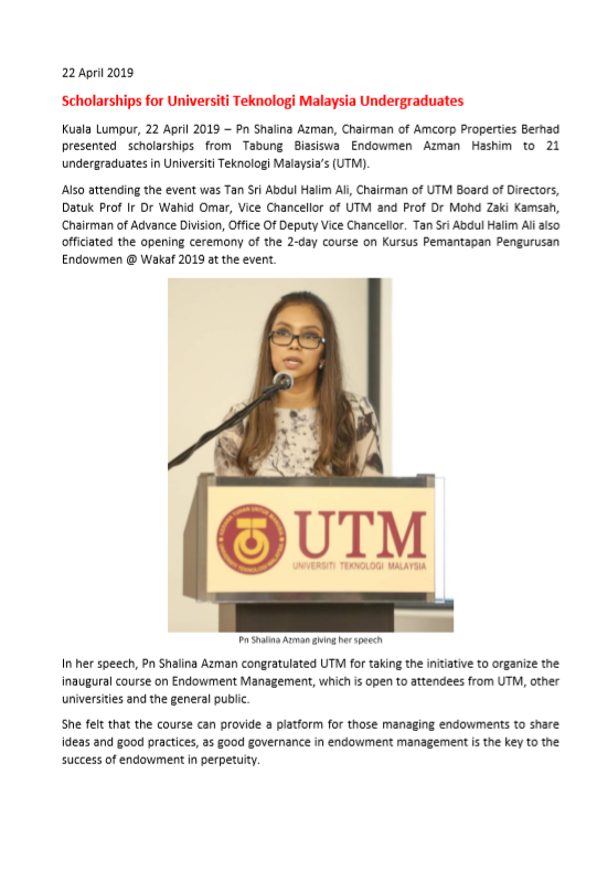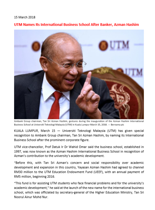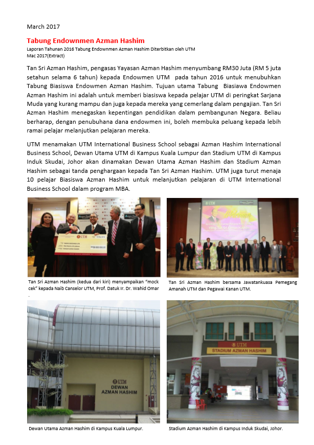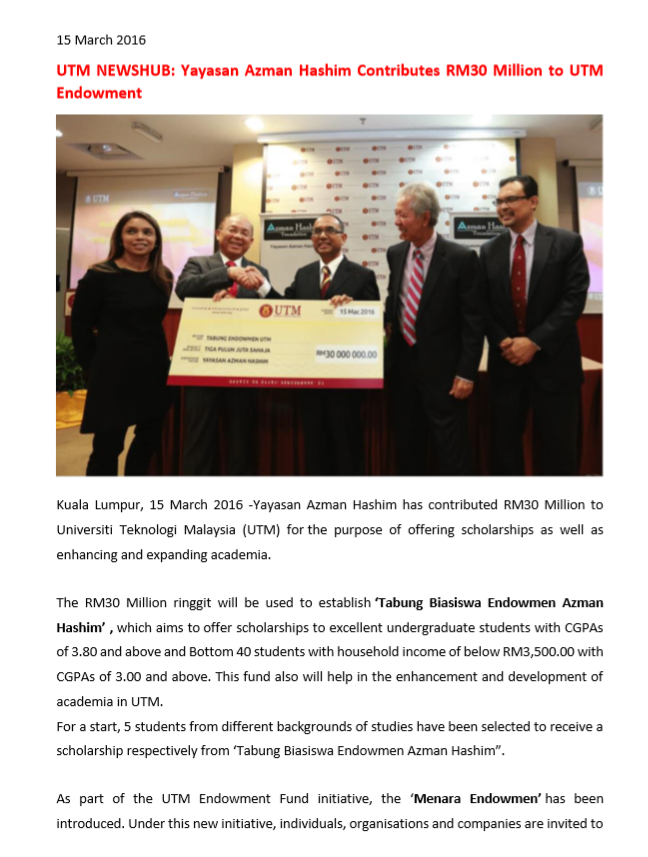 UTM NEWSHUB : Yayasan Azman Hashim Contributes RM30 Million to UTM Endowment