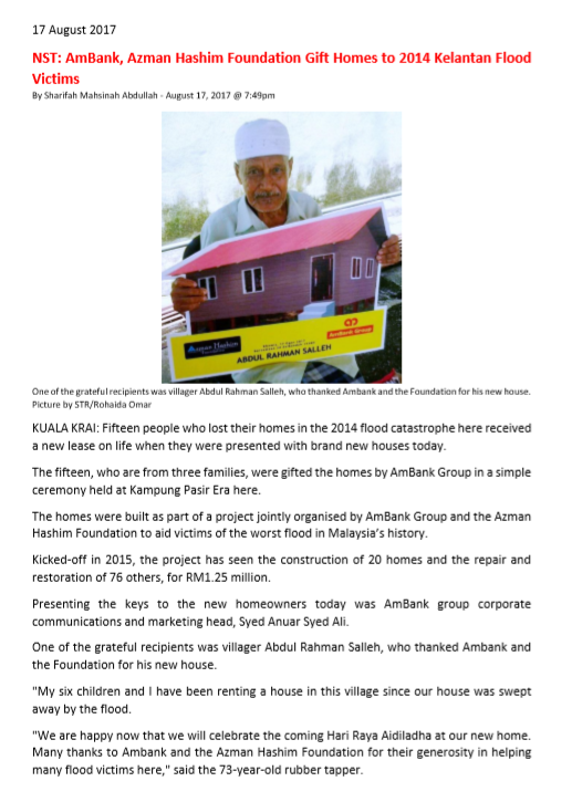 NST : AmBank, Azman Hashim Foundation Gift Homes to 2014 Kelantan Flood Victims