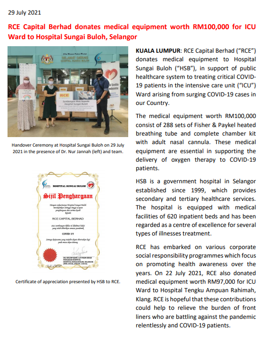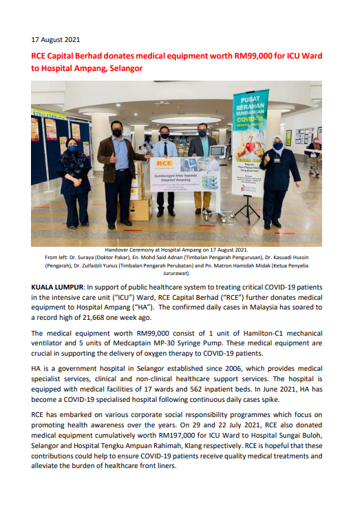 RCE Capital Berhad donates medical equipment worth RM100,000 for ICU Ward to Hospital Sungai Buloh, Selangor