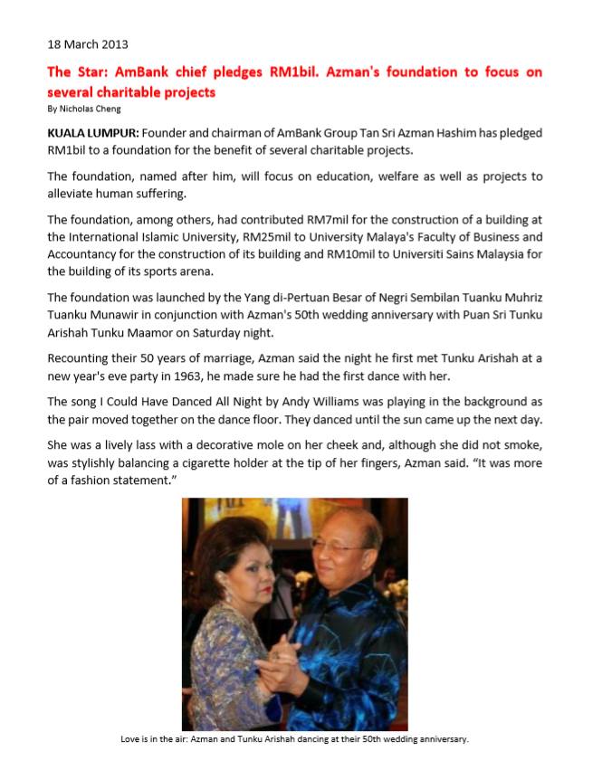 The Star : AmBank chief pledges RM1bil. Azman's foundation to focus on several charitable projects