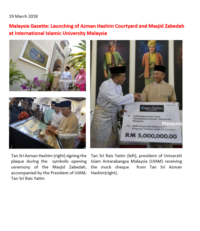 Malaysia Gazette : Launching of Azman Hashim Courtyard and Masjid Zabedah at International Islamic University Malaysia