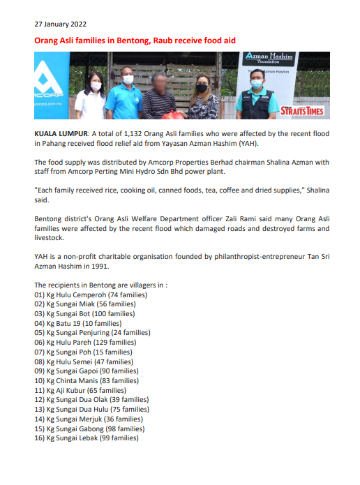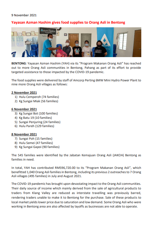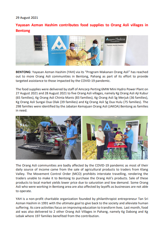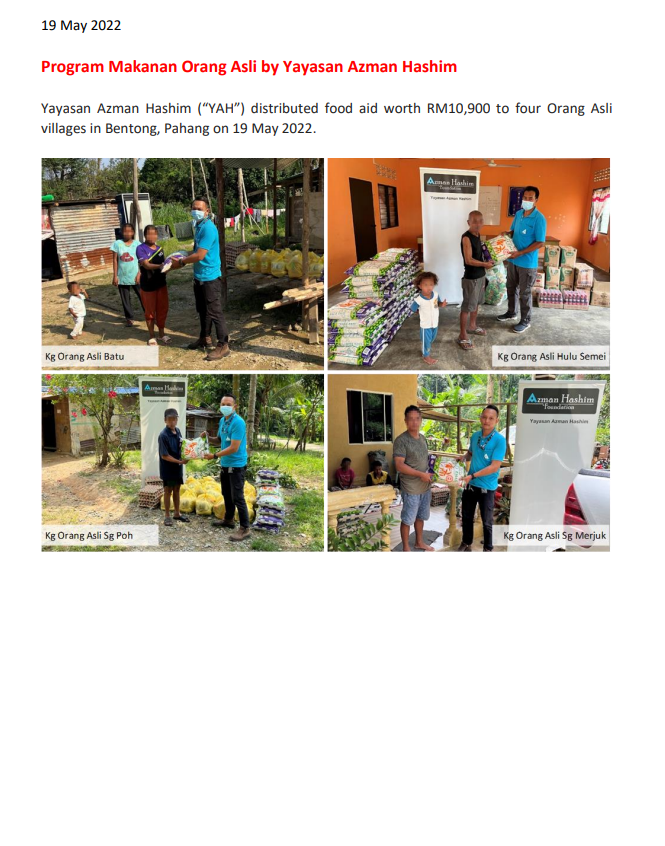Yayasan Azman Hashim contributes food supplies to Orang Asli villages in Bentong