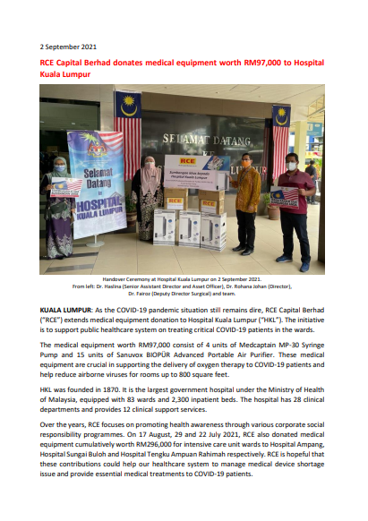 RCE Capital Berhad donates medical equipment worth RM97,000 to Hospital Kuala Lumpur