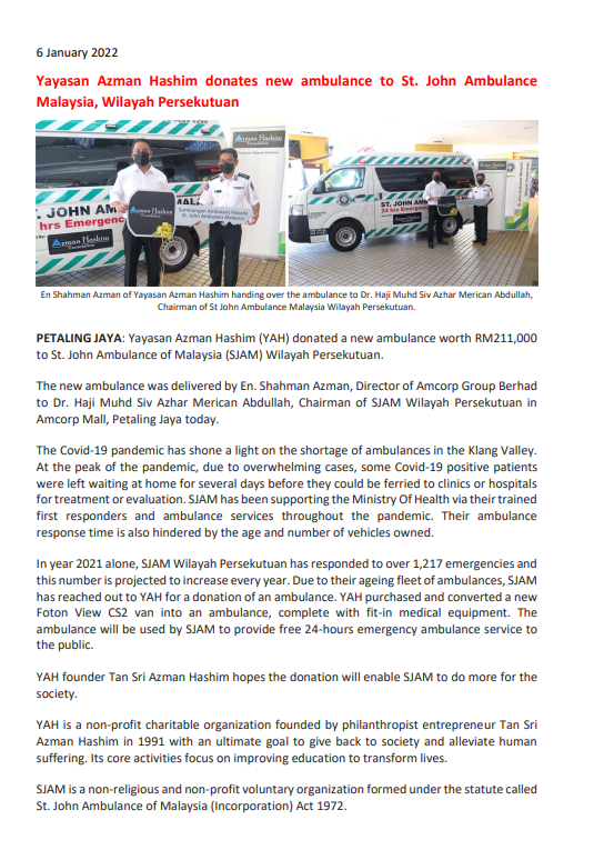Yayasan Azman Hashim donates new ambulance to St. John Ambulance Malaysia, Wilayah Persekutuan