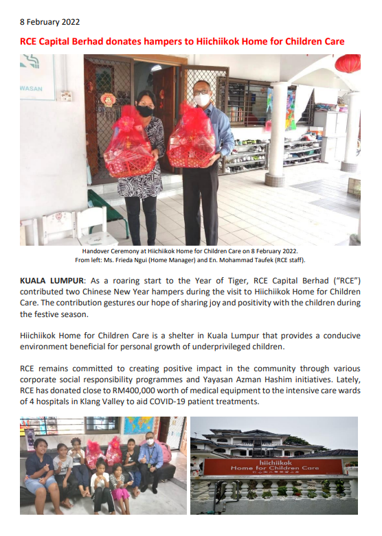 RCE Capital Berhad donates hampers to Hiichiikok Home for Children Care