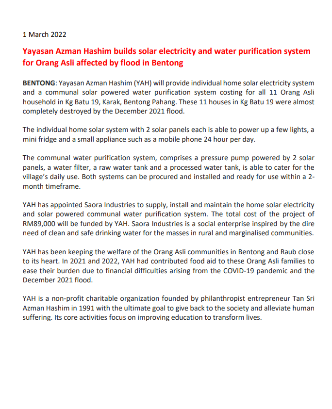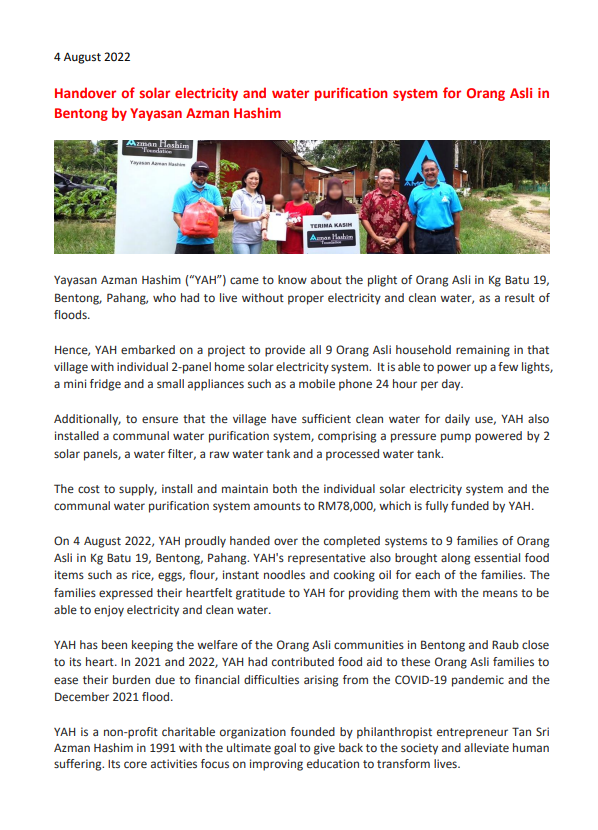 Yayasan Azman Hashim builds solar electricity and water purification system for Orang Asli affected by flood in Bentong