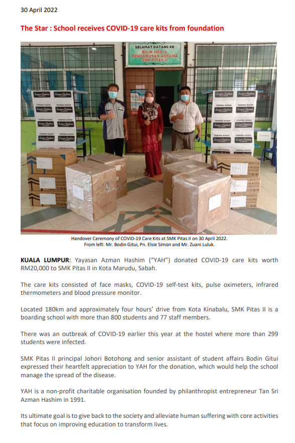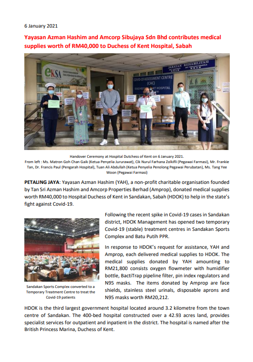 Yayasan Azman Hashim and Amcorp Sibujaya Sdn Bhd contributes medical supplies worth of RM40,000 to Duchess of Kent Hospital, Sabah