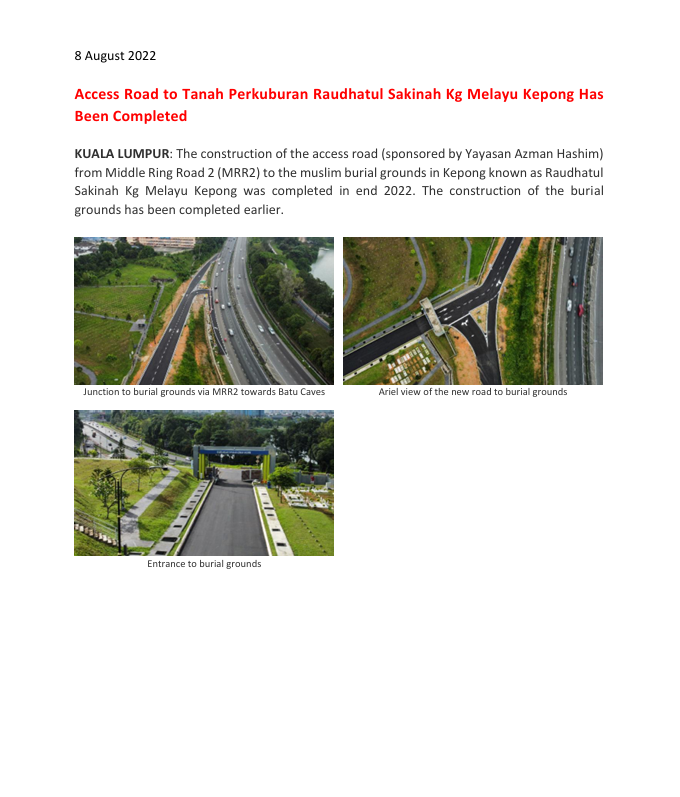 Access Road to Tanah Perkuburan Raudhatul Sakinah Kg Melayu Kepong Has Been Completed