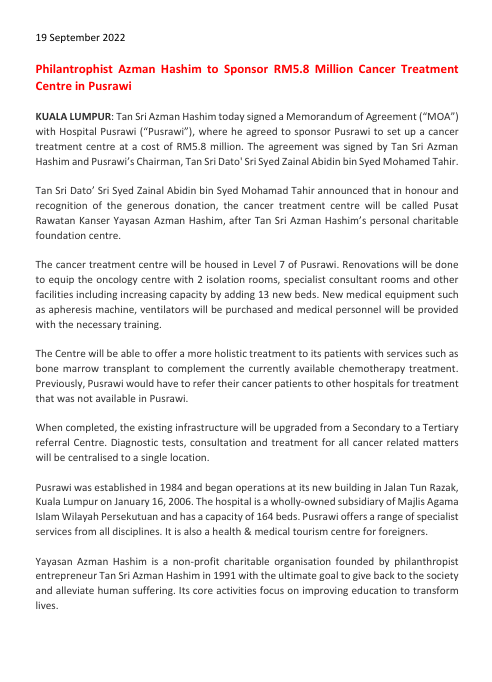 Philantrophist Azman Hashim to Sponsor RM5.8 Million Cancer Treatment Centre in Pusrawi