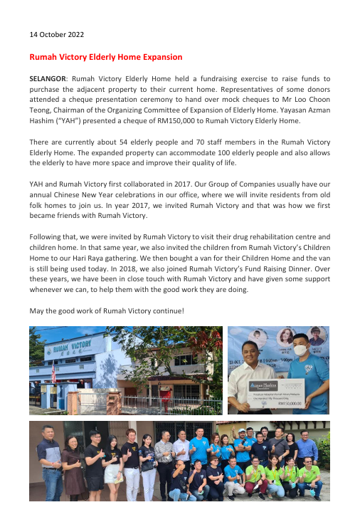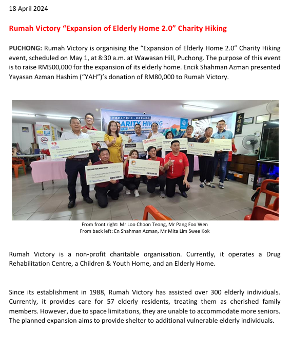 Rumah Victory “Expansion of Elderly Home 2.0” Charity Hiking