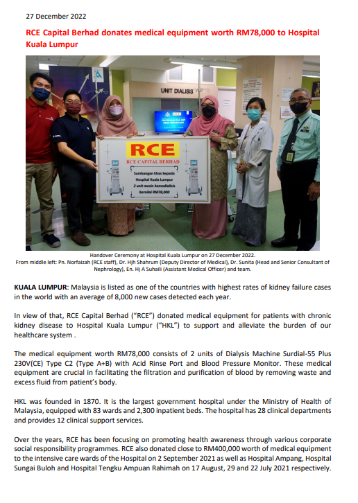 RCE Capital Berhad donates medical equipment worth RM78,000 to Hospital Kuala Lumpur