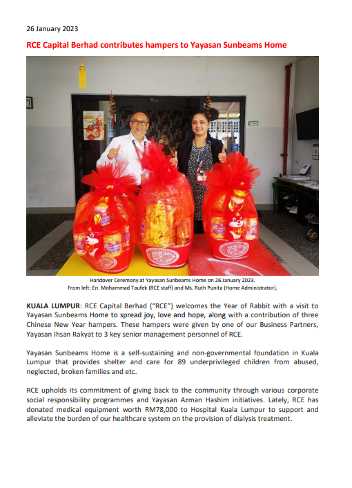 RCE Capital Berhad contributes hampers to Yayasan Sunbeams Home