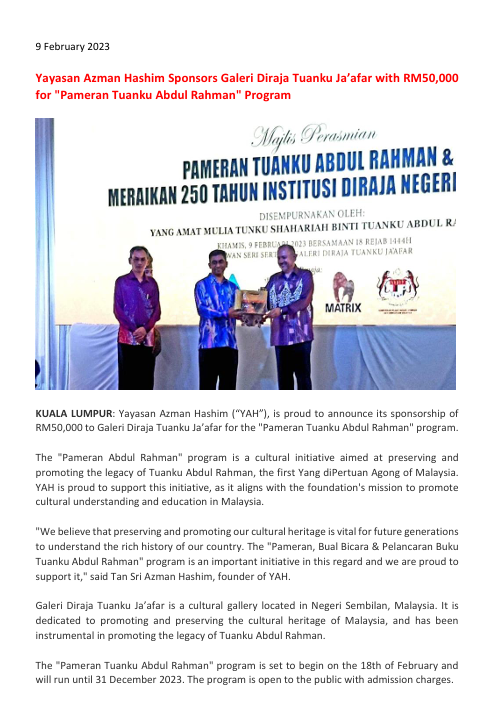Yayasan Azman Hashim Sponsors Galeri Diraja Tuanku Ja’afar with RM50,000 for “Pameran Tuanku Abdul Rahman” Program