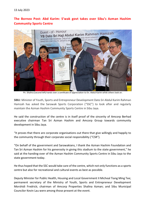 The Borneo Post: Abd Karim: S’wak govt takes over Sibu’s Azman Hashim Community Sports Centre