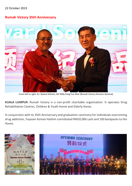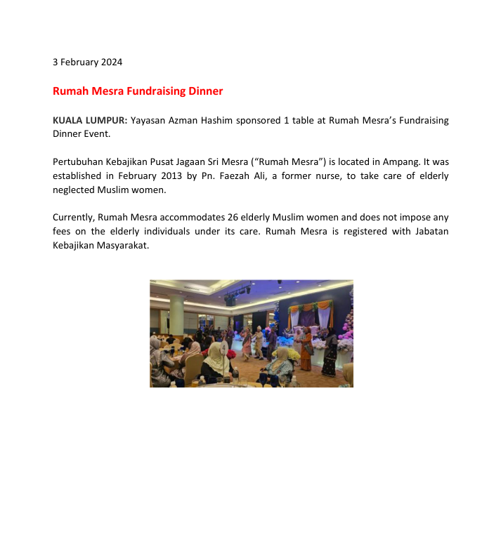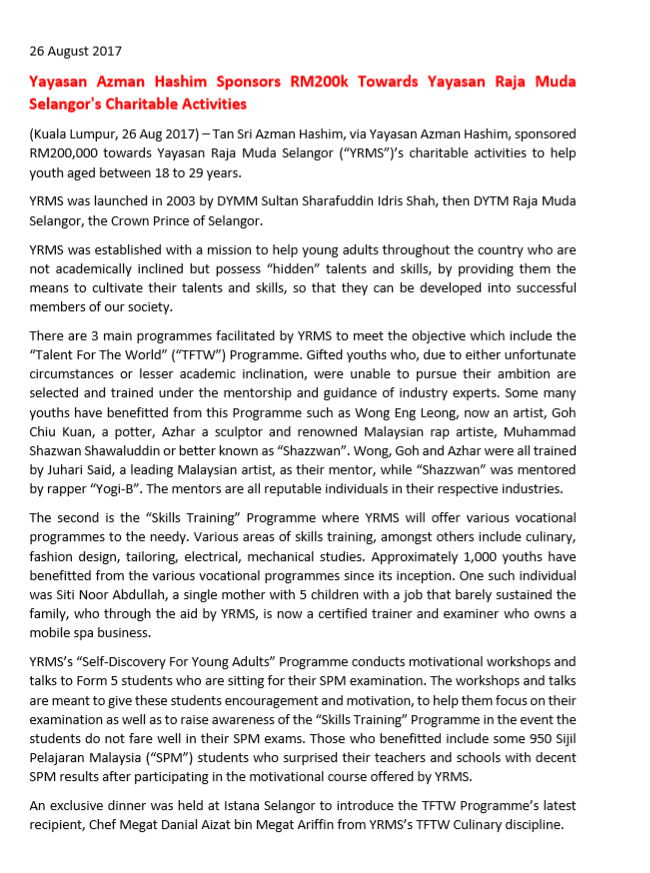 Yayasan Azman Hashim Sponsors RM200k Towards Yayasan Raja Muda Selangor's Charitable Activities