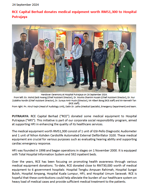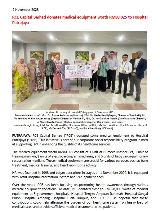 RCE Capital Berhad donates medical equipment worth RM80,025 to Hospital Putrajaya