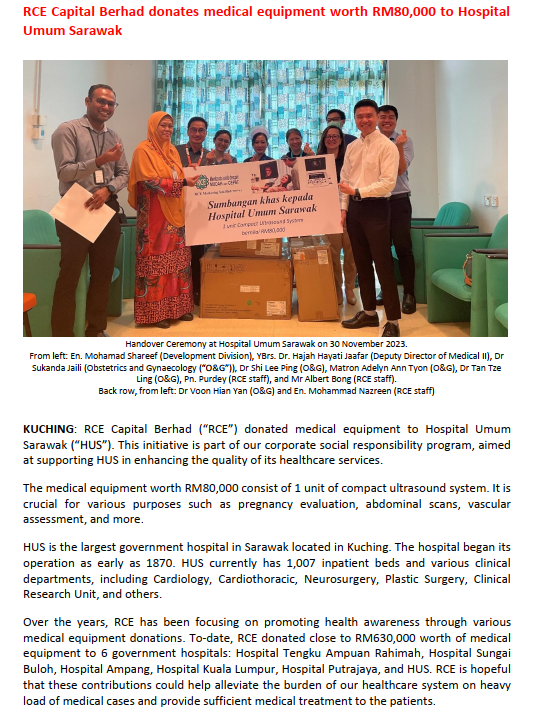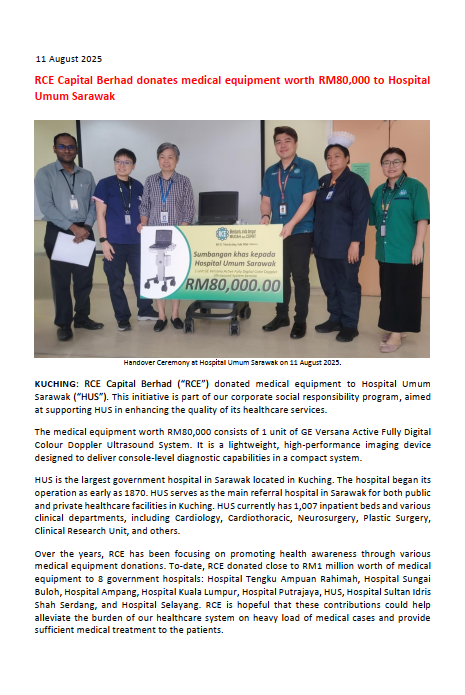 RCE Capital Berhad donates medical equipment worth RM80,000 to Hospital Umum Sarawak