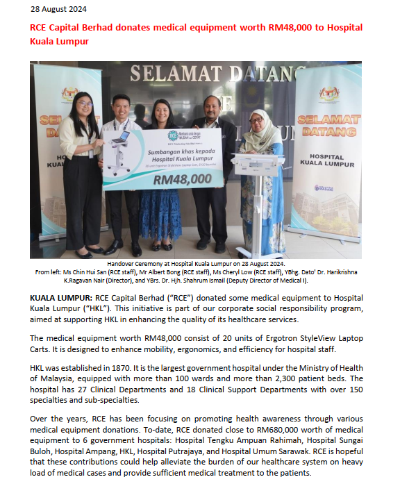 RCE Capital Berhad donates medical equipment worth RM48,000 to Hospital Kuala Lumpur
