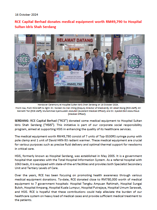 RCE Capital Berhad donates medical equipment worth RM49,790 to Hospital Sultan Idris Shah Serdang