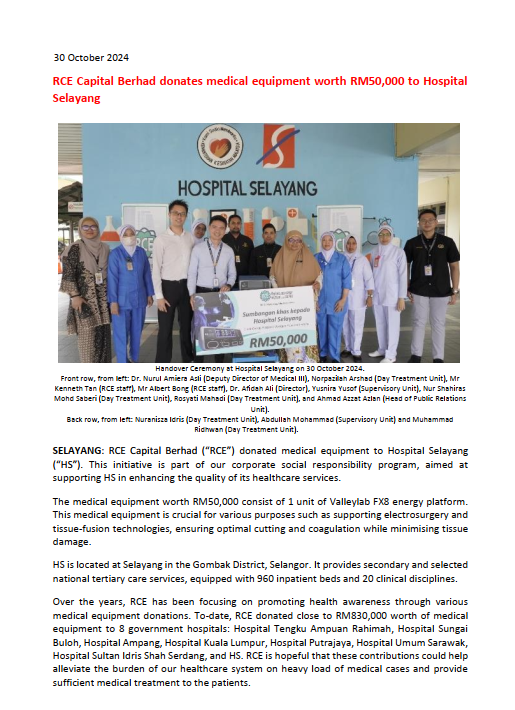 RCE Capital Berhad donates medical equipment worth RM50,000 to Hospital Selayang