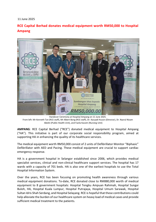 RCE Capital Berhad donates medical equipment worth RM50,000 to Hospital Ampang
