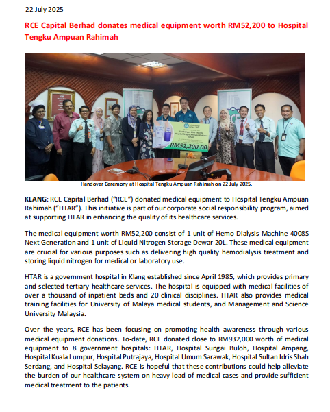 RCE Capital Berhad donates medical equipment worth RM52,200 to Hospital Tengku Ampuan Rahimah