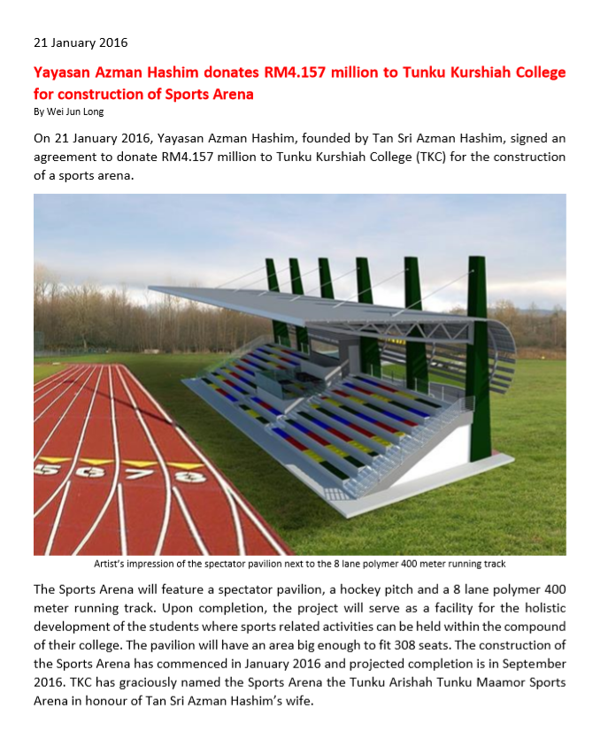 Yayasan Azman Hashim donates RM4.157 million to Tunku Kurshiah College for construction of Sports Arena
