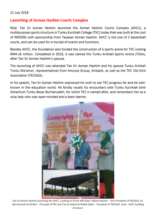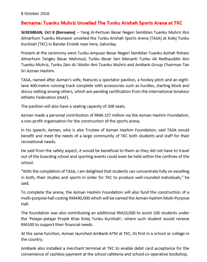 Bernama : Tuanku Muhriz Unveiled The Tunku Arishah Sports Arena at TKC