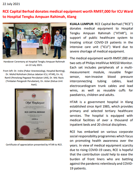RCE Capital Berhad donates medical equipment worth RM97,000 for ICU Ward to Hospital Tengku Ampuan Rahimah, Klang