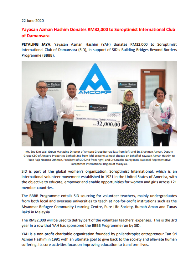 Yayasan Azman Hashim Donates RM32,000 to Soroptimist International Club of Damansara