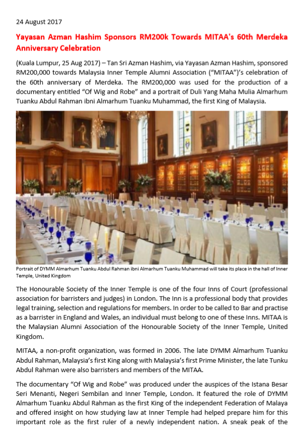 Yayasan Azman Hashim Sponsors RM200k Towards MITAA's 60th Merdeka Anniversary Celebration