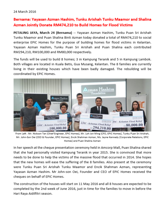 Bernama : Yayasan Azman Hashim, Tunku Arishah Tunku Maamor and Shalina Azman Jointly Donate RM474,210 to Build Homes for Flood Victims