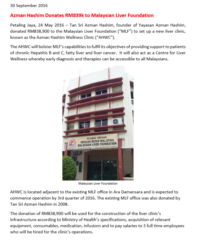 Azman Hashim Donates RM839k to Malaysian Liver Foundation