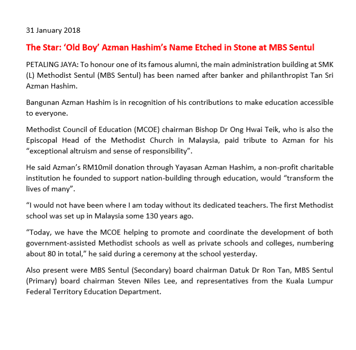 The Star : 'Old Boy' Azman Hashim's Name Etched in Stone at MBS Sentul