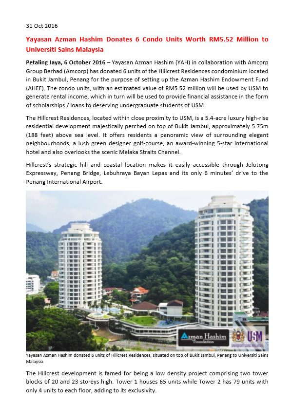 Yayasan Azman Hashim Donates 6 Condo Units Worth RM5.52 Million to Universiti Sains Malaysia