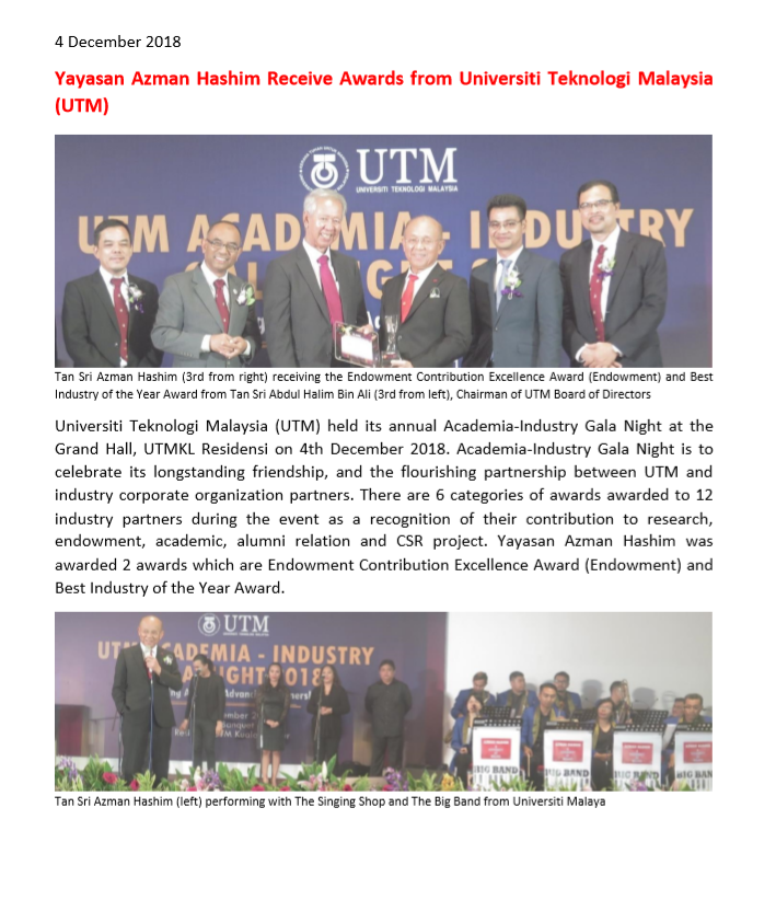 Yayasan Azman Hashim Receive Awards from Universiti Teknologi Malaysia (UTM)