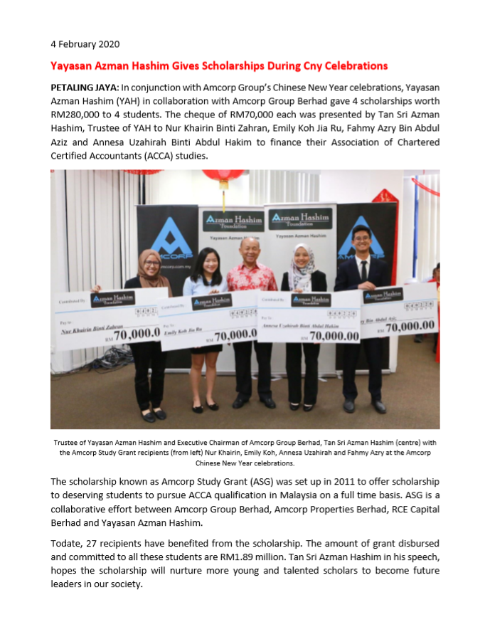 Yayasan Azman Hashim Gives Scholarships During Cny Celebrations