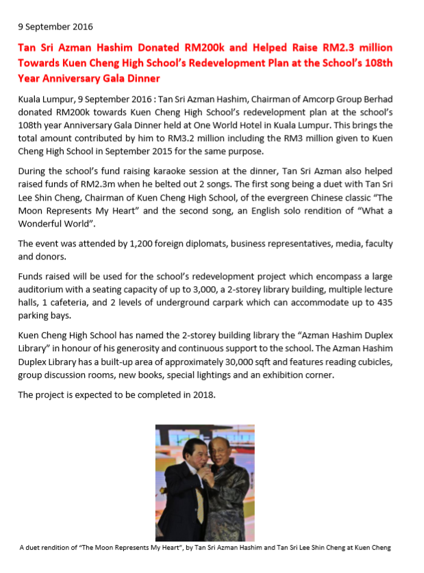 Tan Sri Azman Hashim Donated RM200k and Helped Raise RM2.3 million Towards Kuen Cheng High School's Redevelopment Plan at the School's 108th Year Anniversary Gala Dinner